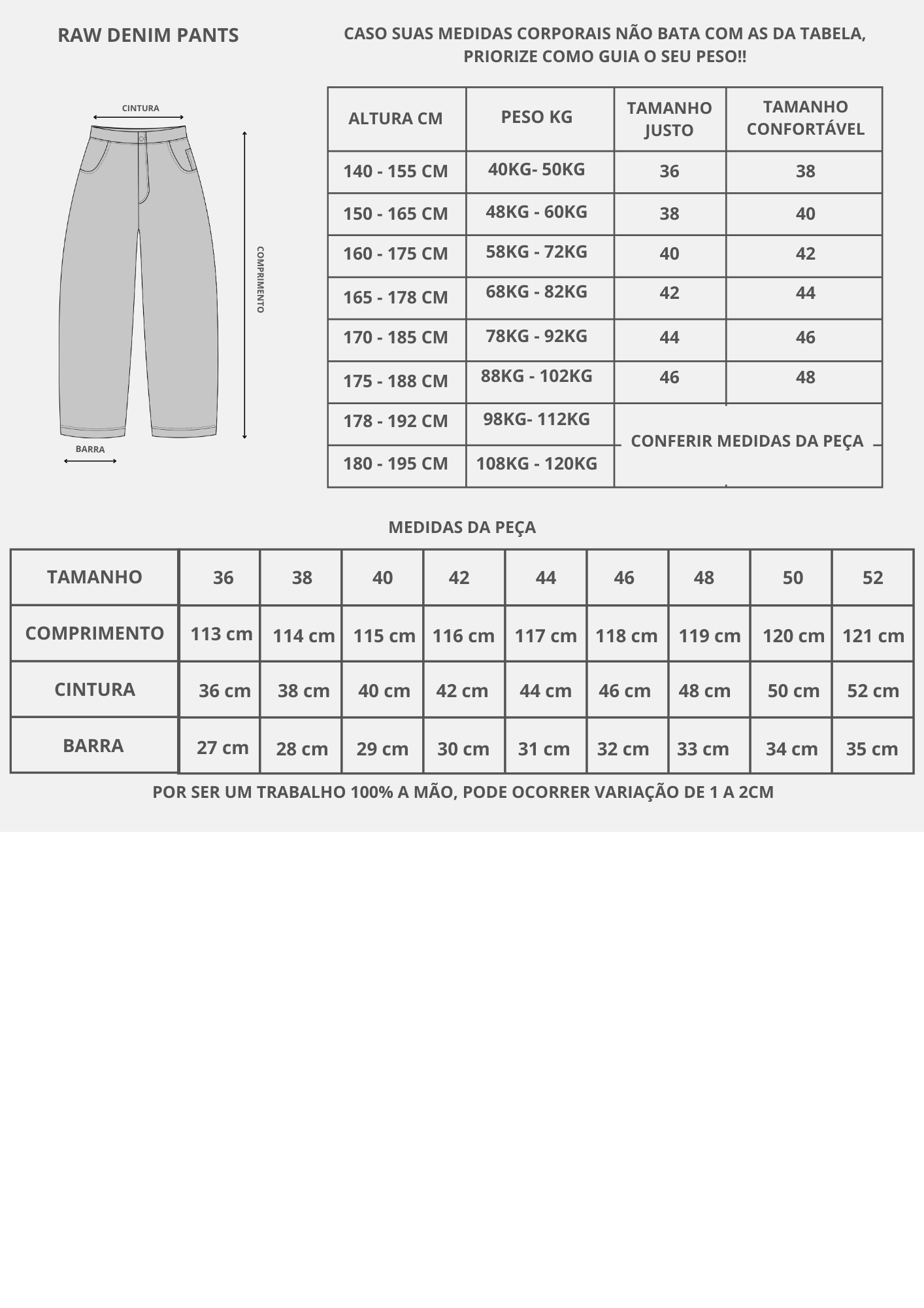 Por ser um jeans cru ele é muito mais estruturado do que o jeans lavado convencional, o que proporciona uma melhor estrutura e caimento para a peça. O Raw Denim tende a ser um tecido mais rigido e menos flexivel, visto que ele não possui lavagem (não é amaciado)